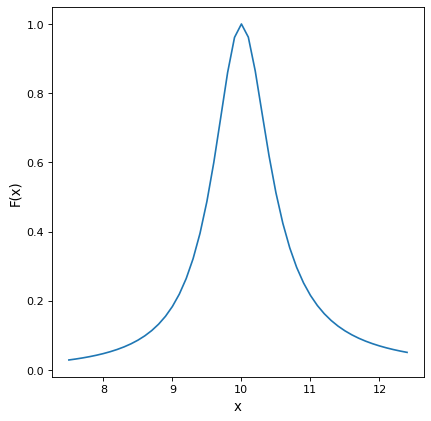 import numpy as np import matplotlib.pyplot as plt from astropy.modeling.models import Drude1D fig, ax = plt.subplots() # generate the curves and plot them x = np.arange(7.5 , 12.5 , 0.1) dmodel = Drude1D(amplitude=1.0, fwhm=1.0, x_0=10.0) ax.plot(x, dmodel(x)) ax.set_xlabel('x') ax.set_ylabel('F(x)') plt.show()